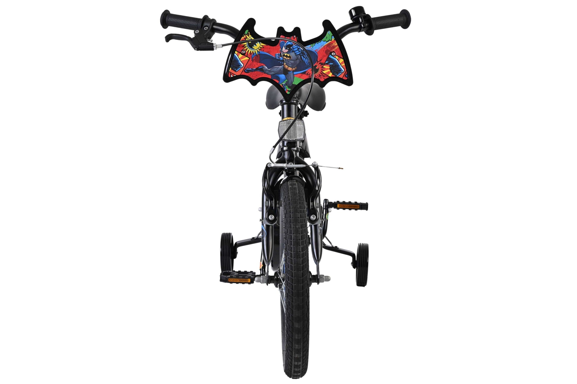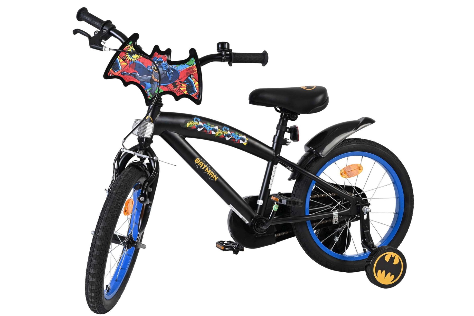 Den svarta ramen med blå Batman-detaljer ger cykeln en cool superhjälte-look. Det robusta metallchassit och de extra långa stänkskärmarna gör cykeln både tålig och praktisk för vardagsbruk.