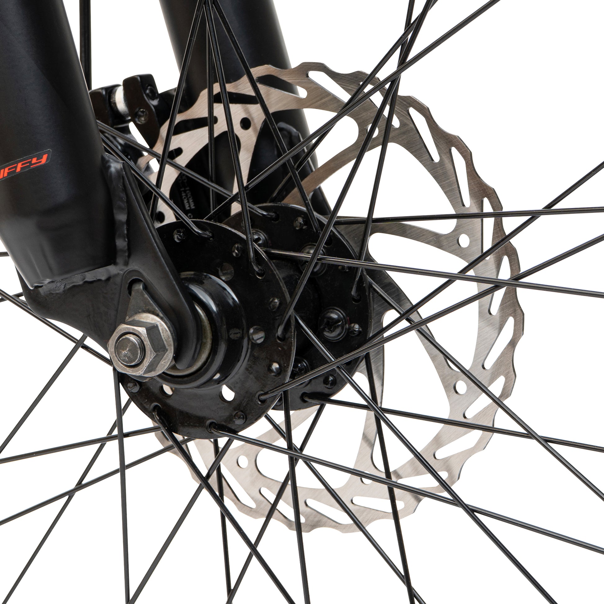 Den robusta stålramen med dual suspension ger mjukare körning över rötter, stenar och ojämnheter, medan de grovmönstrade 27.5” MTB-däcken biter ordentligt i underlaget. Sadeln är vadderad och snabbjusteras enkelt via quick release.