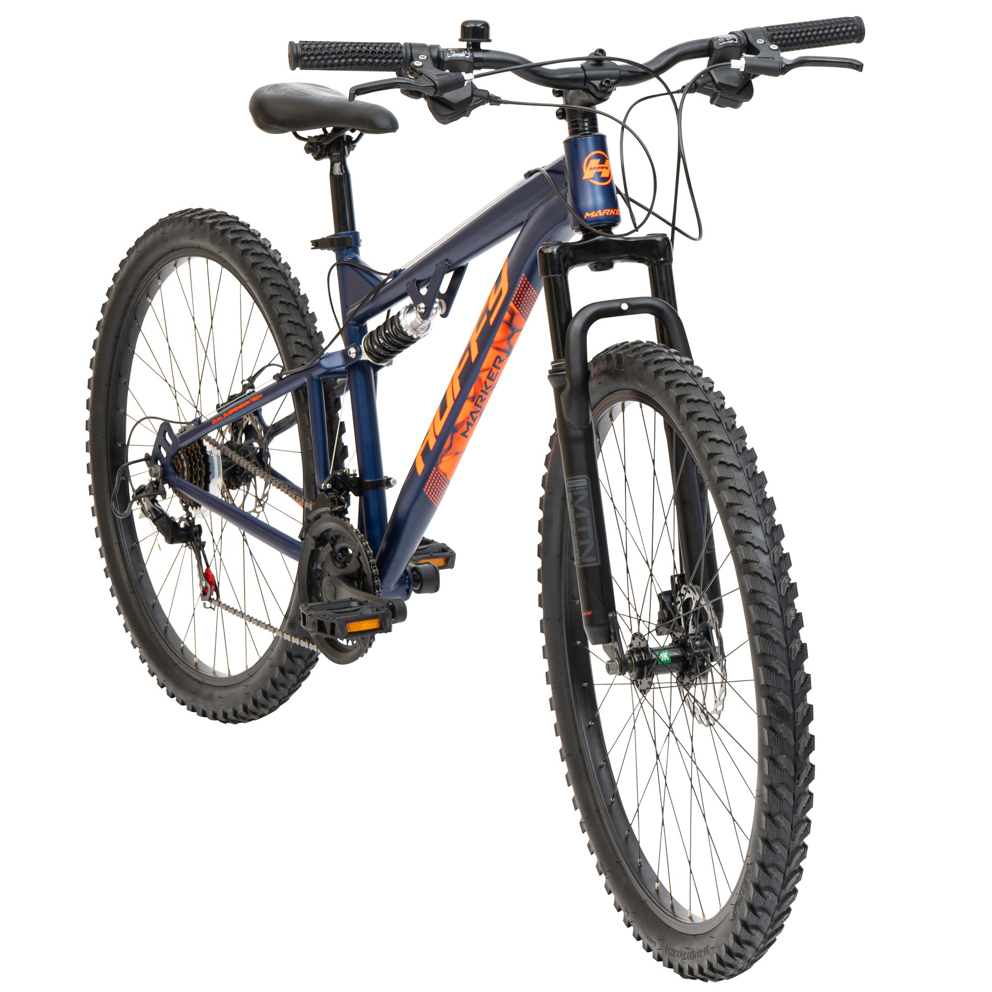 Huffy Marker 27.5” i blått är en kraftfull fullfjädrad mountainbike byggd för tonåringar som vill ut på riktiga stigar och få både kontroll och komfort i kuperad terräng. Med 21 Shimano-växlar, responsiva trigger shifters och dubbla skivbromsar får du en cykel som klarar branta backar, snabba växlingar och precisa inbromsningar.