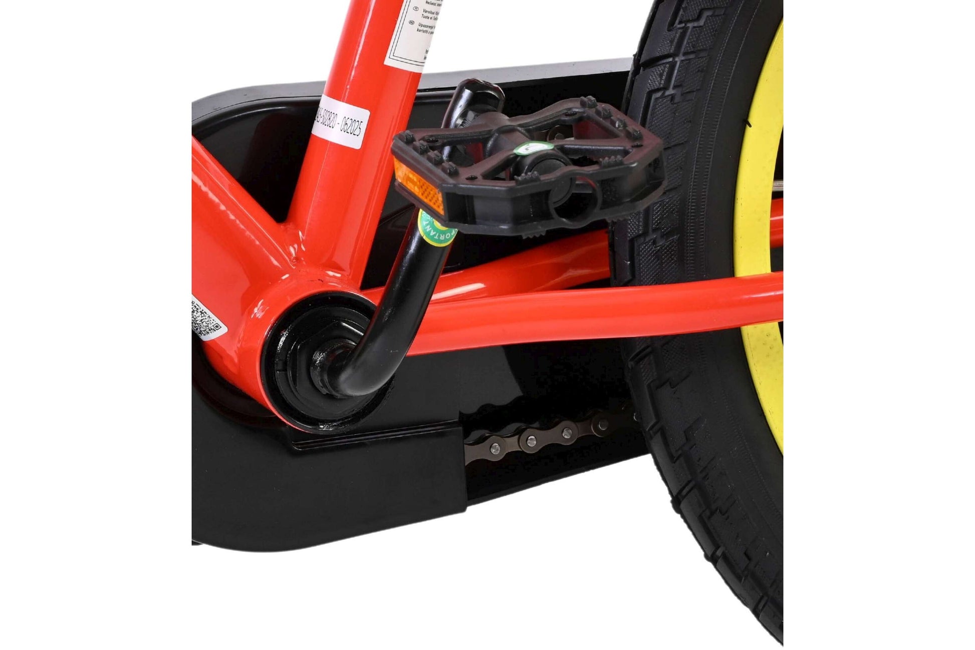 Den röda stålramen pryds av Paw Patrol-detaljer som gör cykeln både lekfull och unik. En sluten kedjeskydd skyddar kläderna och ger extra säkerhet, medan de stabila aluminiumfälgarna med justerbara ekrar gör cykeln hållbar och snygg.