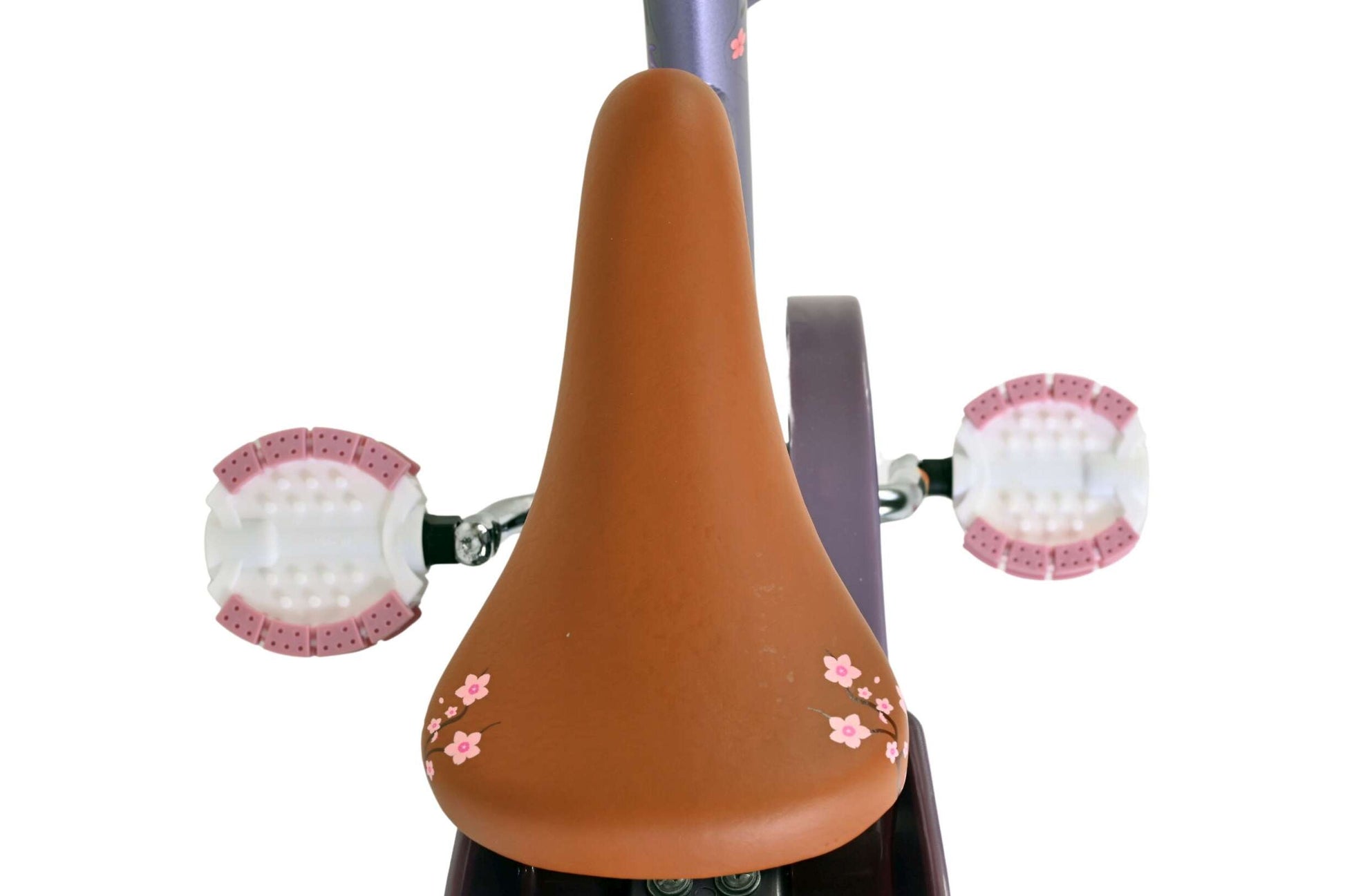 Den lila metallramen med en ramhöjd på 20 cm gör cykeln stabil och lätt att kliva på. Den charmiga flätade korgen framtill ger plats för små favoriter under cykelturen, medan blommiga detaljer och lekfull design gör cykeln extra älskvärd.