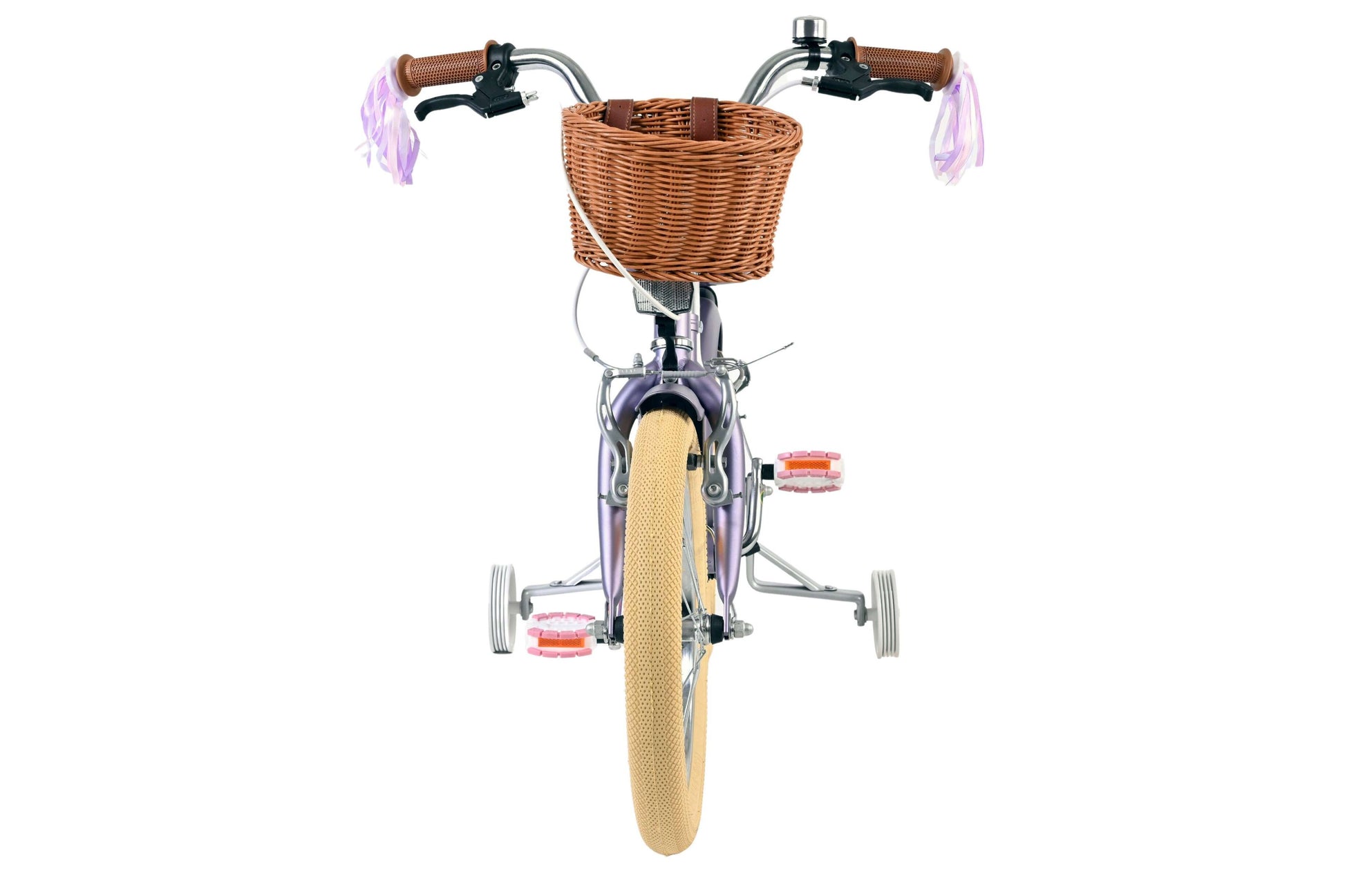Den lila ramen tillsammans med flätad korg framtill och docksits baktill gör cykeln både charmig och praktisk. Två handbromsar, slutet kedjeskydd och stödhjul ger trygghet medan barnet lär sig cykla.