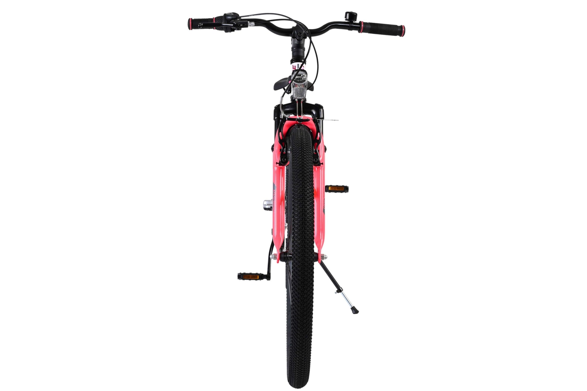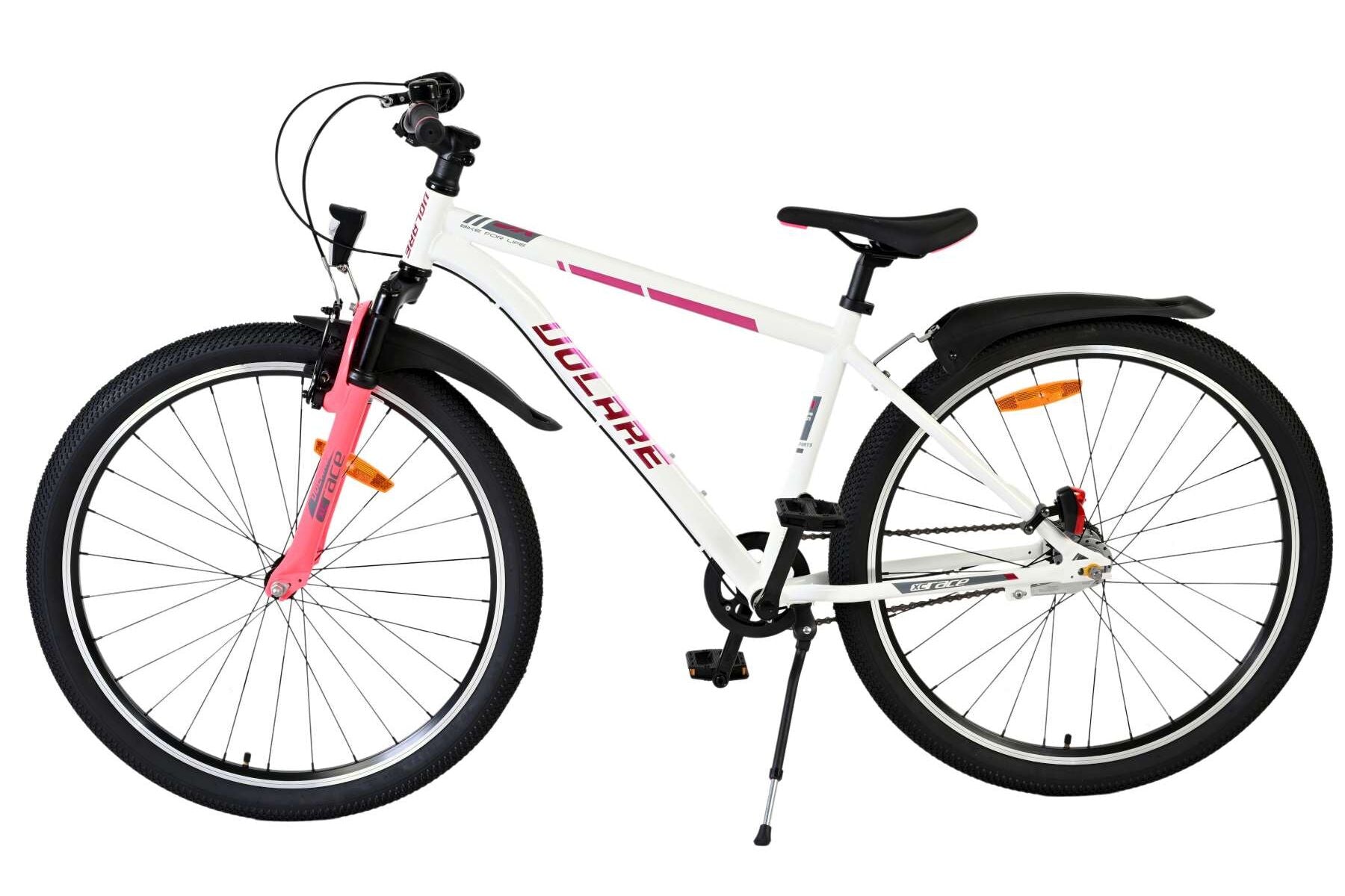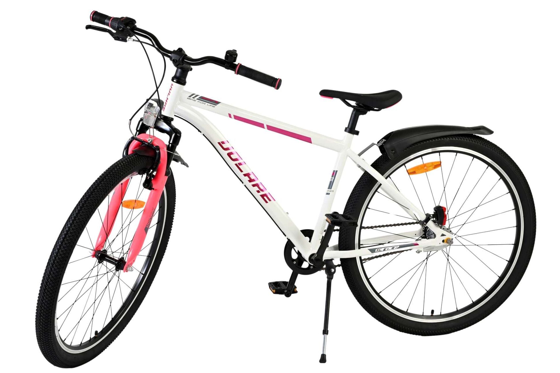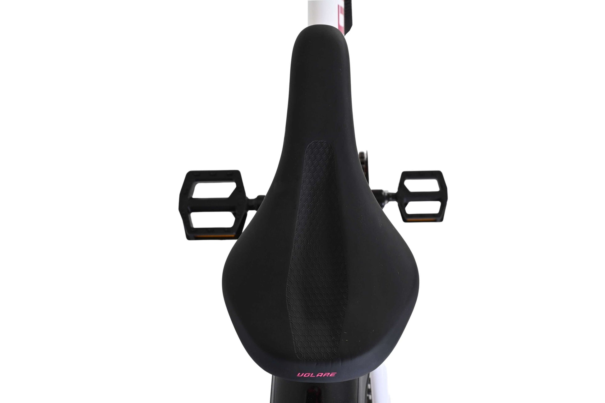 Den vita ramen med rosa detaljer ger cykeln en sportig men elegant look. Den starka stålramen med en ramhöjd på 41 cm ger stabilitet och hållbarhet, medan aluminiumfälgar med justerbara ekrar bidrar till lätt vikt och jämn körning. Ett stöd i aluminium gör att cykeln alltid står stadigt när den parkeras.